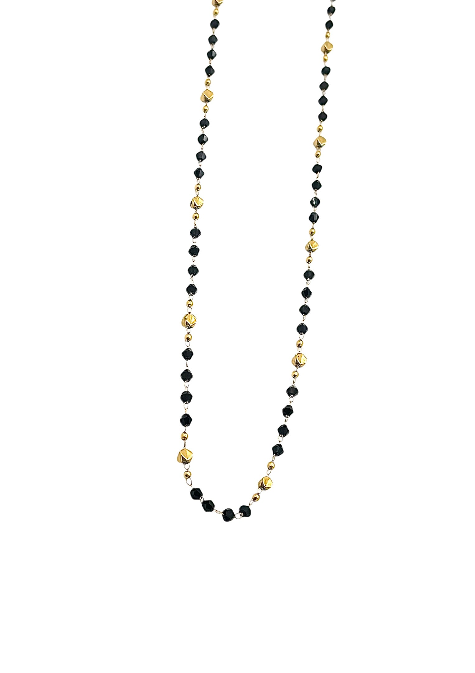 Elegancki naszyjnik łańcuszkowy z czarnymi koralikami i złotymi akcentami wykonany z wysokiej jakości stali chirurgicznej.