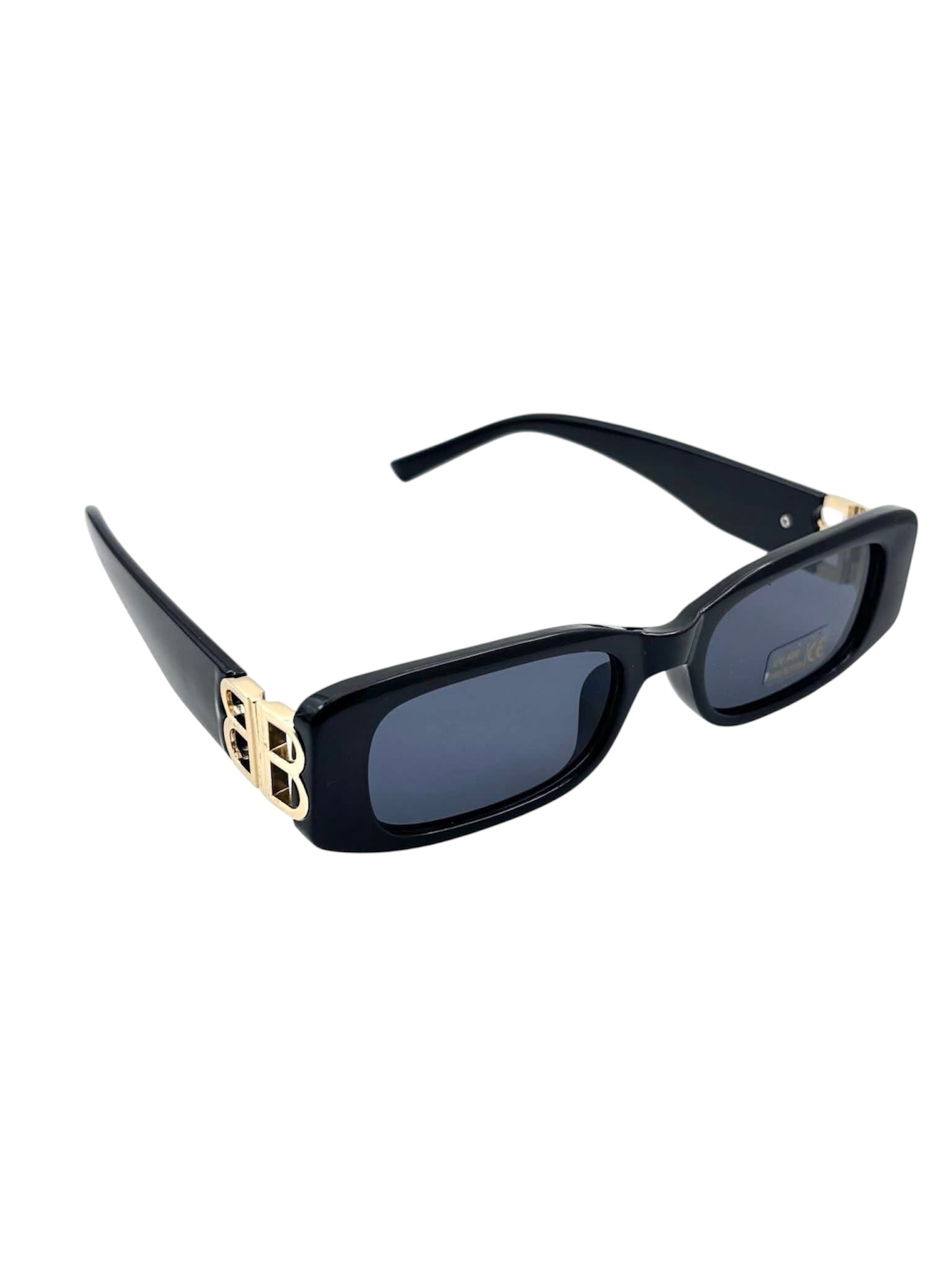 Eleganckie, czarne, prostokątne okulary przeciwsłoneczne z filtrem UV400 i subtelnymi złotymi detalami, które nadają nowoczesny, stylowy wygląd. Lekkie i wygodne, idealne na co dzień, dodadzą szykownego akcentu każdej stylizacji. To ponadczasowy dodatek, idealny zarówno do codziennych, jak i eleganckich stylizacji.
