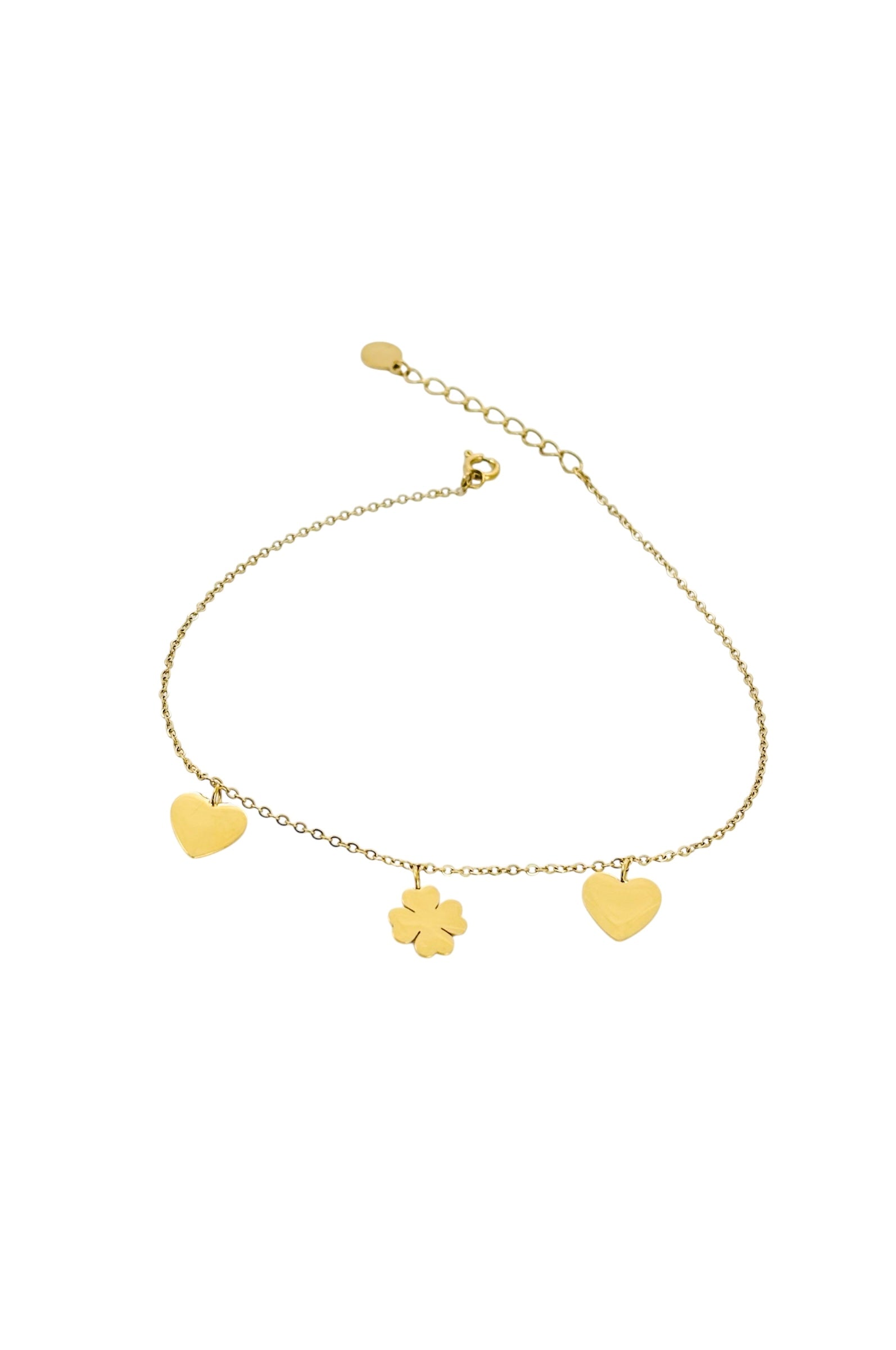 Bransoletka na kostkę z zawieszką w kształcie serca i koniczyny – stal chirurgiczna pozłacana 14-karatowym złotem