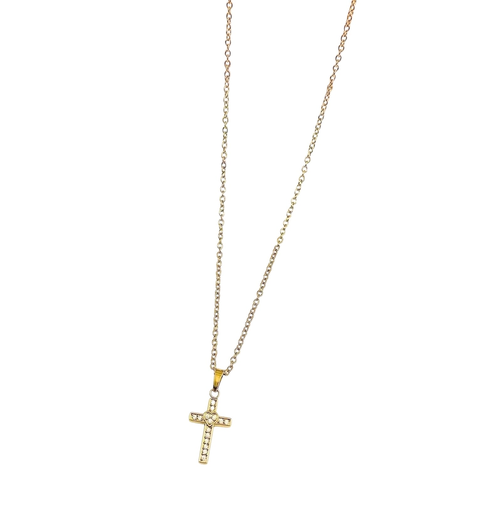 Delikatny złoty naszyjnik z krzyżem, błyszczącymi cyrkoniami i subtelnym akcentem w postaci serduszka.