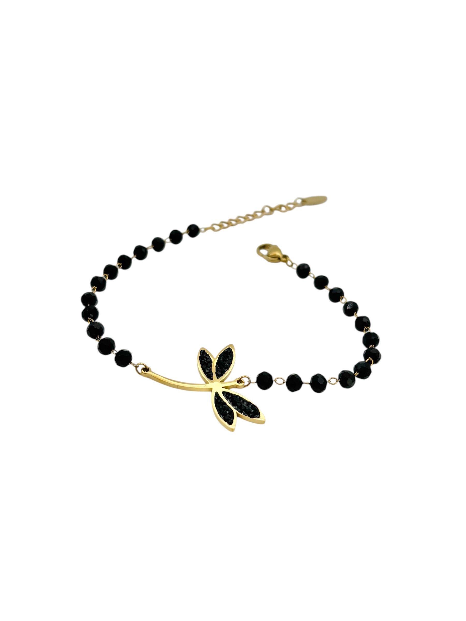 Elegancka i ponadczasowa bransoletka Dragonfly Black wyróżnia się delikatnymi, czarnymi, fasetowanymi koralikami i złotą zawieszką w kształcie ważki z subtelnymi kryształowymi zdobieniami.