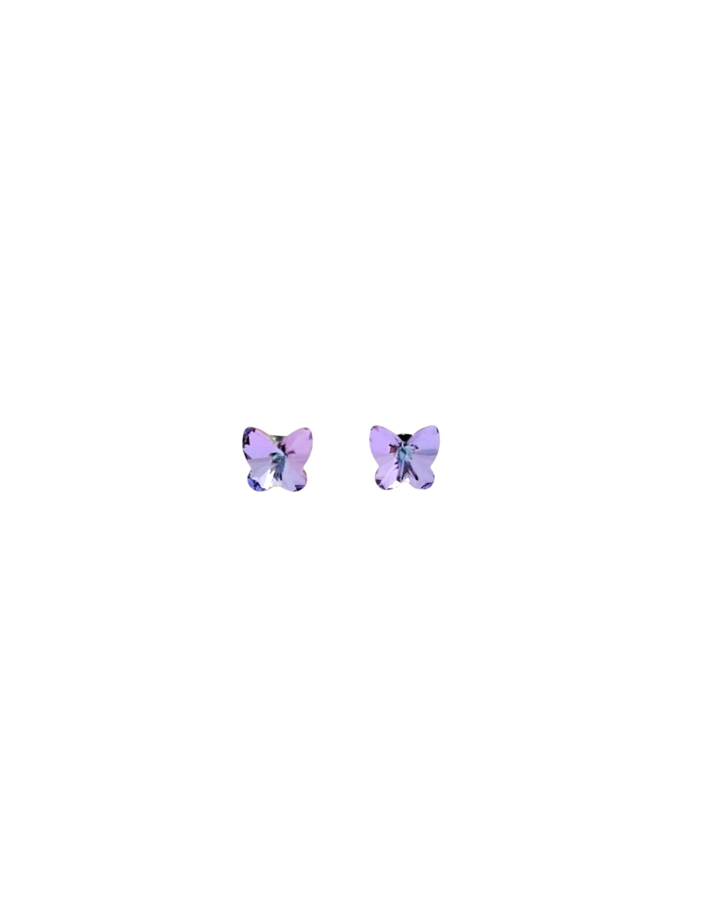 Delikatne kolczyki-sztyfty w kształcie motyli z opalizującym kryształem o subtelnym fioletowym połysku. Wykonane z hipoalergicznej miedzi z wykończeniem w odcieniu srebra, lekkie i wygodne do noszenia na co dzień. Kobiecy, elegancki akcent, idealny do codziennych stylizacji.