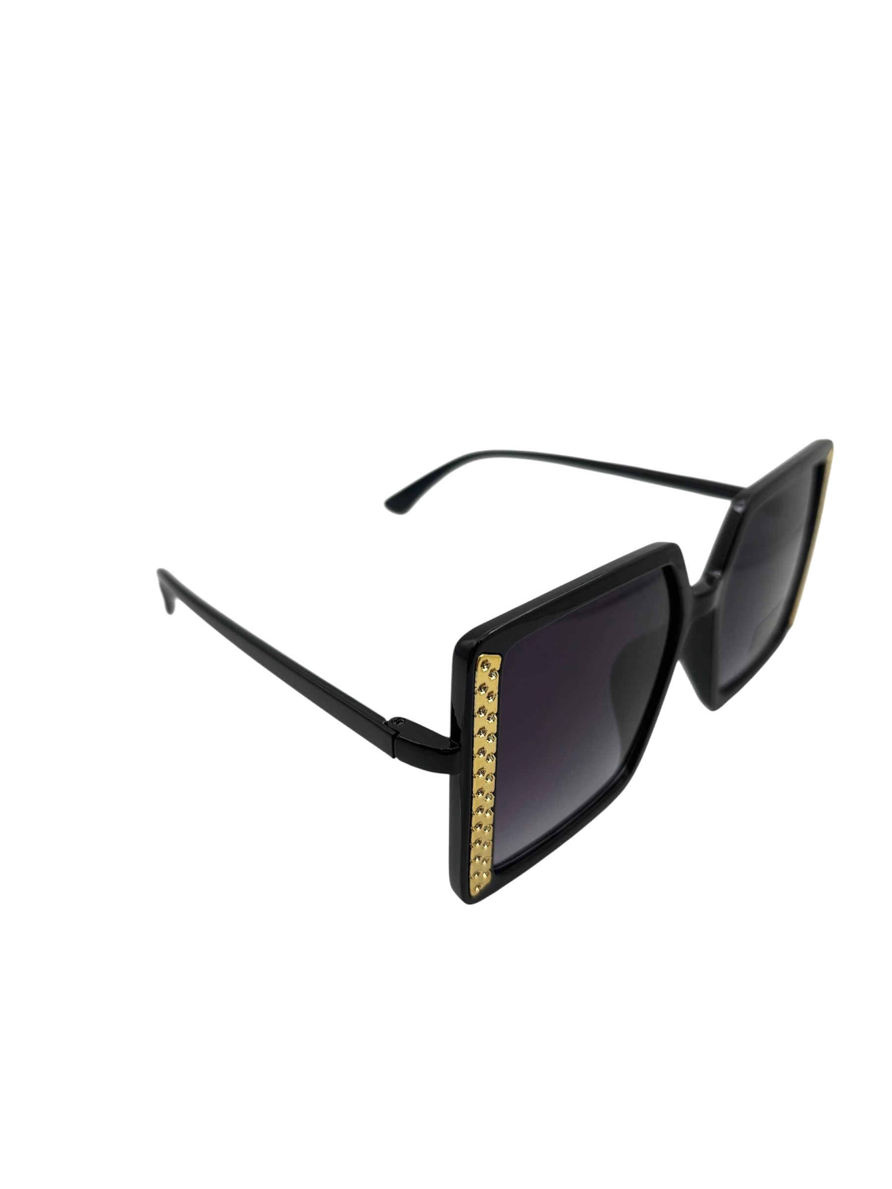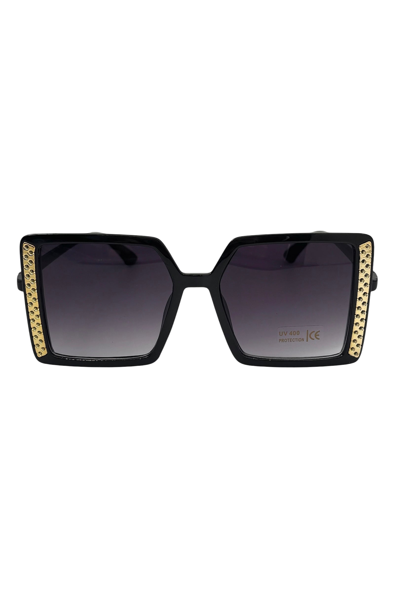 Duże, kwadratowe okulary przeciwsłoneczne z eleganckimi, złotymi detalami po bokach, które nadają im odważny, olśniewający wygląd. Lekkie, a zarazem stylowe, zapewniają ochronę UV400 i całodzienny komfort. Idealne, aby dodać odrobinę luksusu codziennym stylizacjom lub letnim stylizacjom.